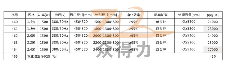 本系列油煙凈化一體機有1.5米、1.8米、2.0米、2.2米和2.4米五種規格,價格詳情請看下圖參數: